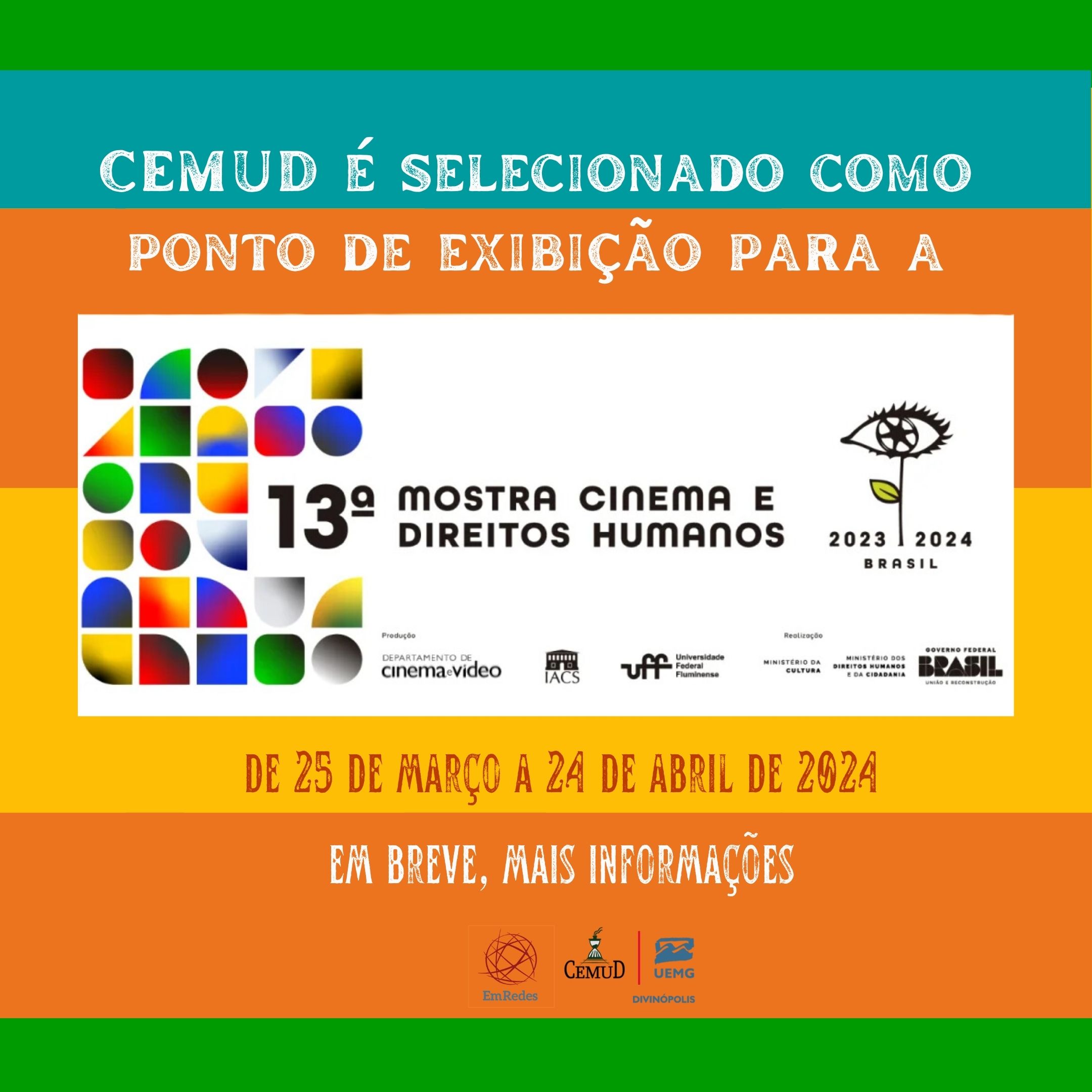 O Centro de Memória Professora Batistina Corgozinho – CEMUD, da UEMG Unidade Divinópolis foi selecionado um dos 257 pontos a participarem, como exibidores, da Mostra Difusão da 13ª Mostra Cinema e Direitos Humanos, que acontece no período de 25 de março a 24 de abril, de forma descentralizada e gratuita por todo Brasil.