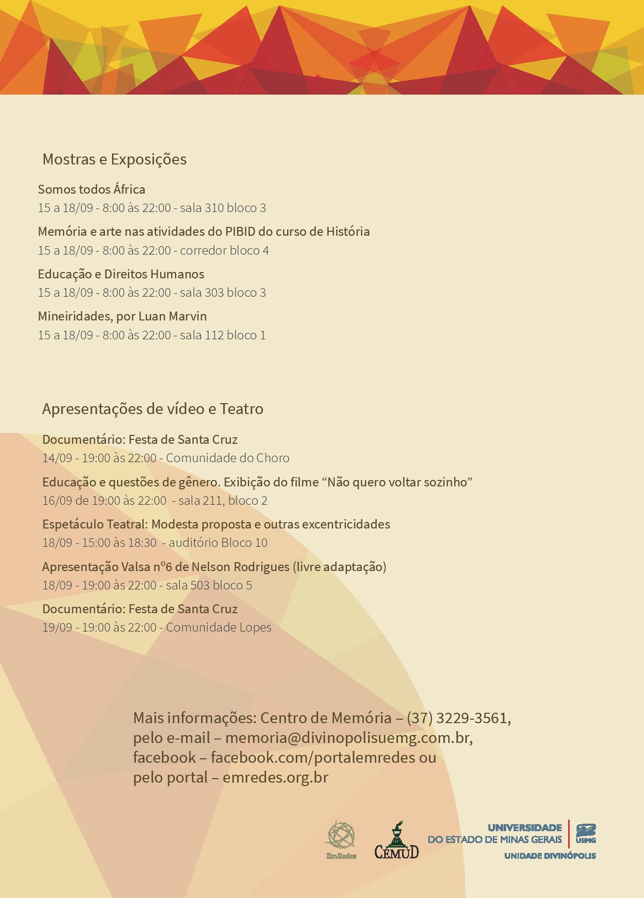 O Centro de Memória Professora Batistina Corgozinho e Portal Emredes convidam para as atividades da 4ª Semana da UEMG. A programação conta com Mesa-Redonda, Rodas de Conversas, Oficinas, Exposições, exibição de documentário e apresentações teatrais! Confira a programação!