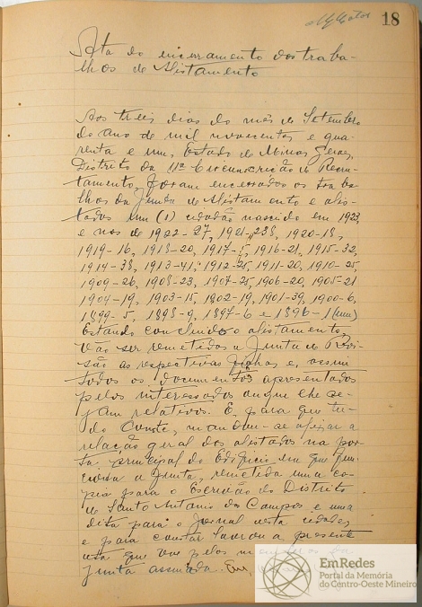 AOS TRES DIAS DO MÊS DE SETEMBRO DE 1941, FORAM ENCERRADOS OS TRABALHOS DA JUNTA DE ALISTAMENTO E ALISTADOS OS CIDADÃOS NASCIDOS ENTRE OS ANOS DE 1896 A 1923.