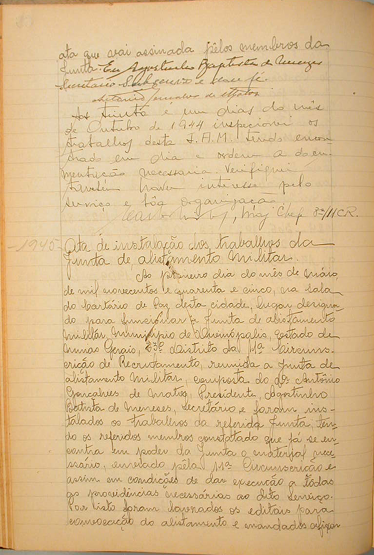 AO 1º DIA DO MÊS DE MAIO DE 1945, NA SALA DO CARTÓRIO DE PAZ, LUGAR DESIGNADO PARA FUNCIONAR A JUNTA DE ALISTAMENTO MILITAR E FORAM INSTALADOS OS TRABALHOS DA REFERIDA JUNTA.