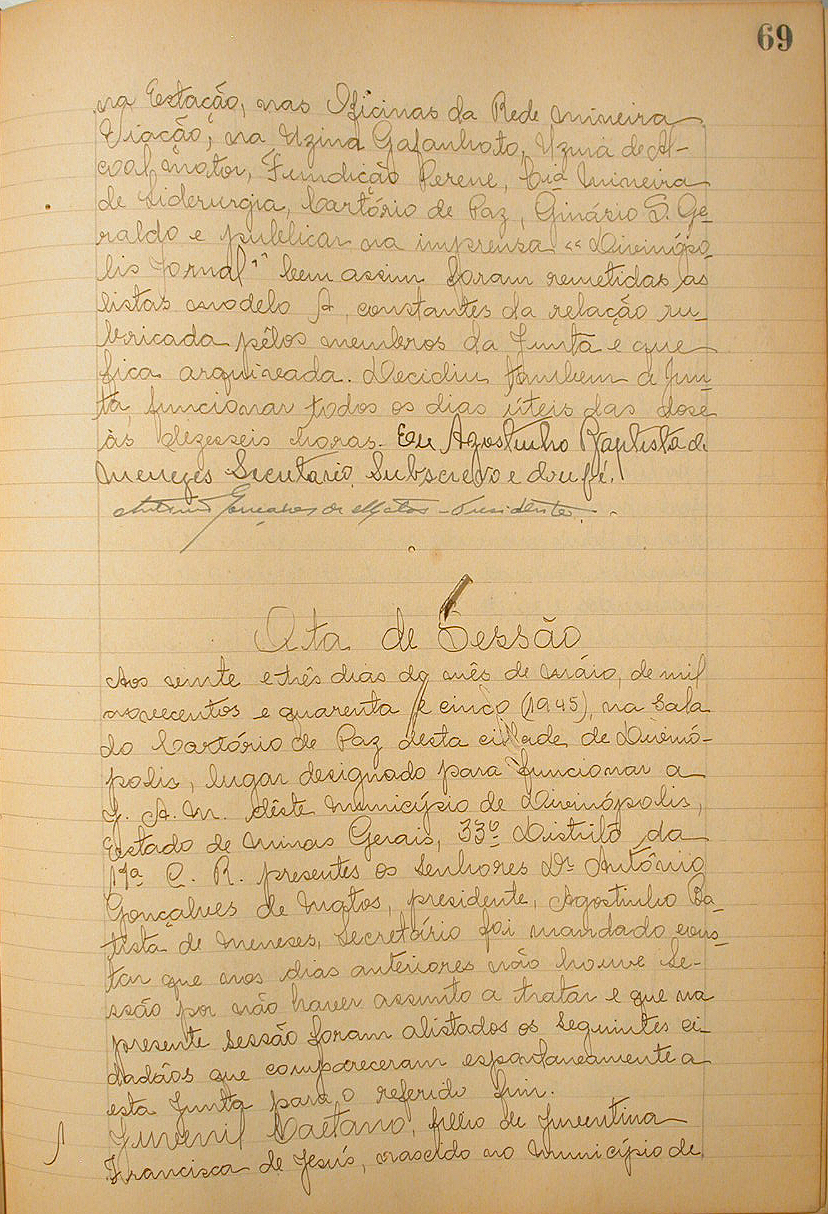AOS VINTE E TRÊS DIAS DO MÊS DE MAIO DE 1945, NA SALA DO CARTÓRIO DE PAZ, LUGAR DESIGNADO PARA FUNCIONAR A JUNTA, FOI MANDADO CONSTAR QUE NOS DIAS ANTERIORES NÃO HOUVE SESSÃO POR NÃO HAVER ASSUNTO A TRATAR E QUE NA PRESENTE SESSÃO FORAM ALISTADOS ESPONTANEAMENTE ALGUNS CIDADÃOS.
