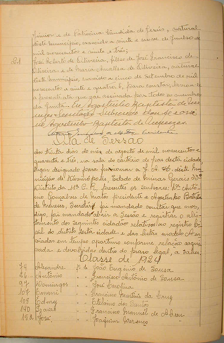 ATA DA SESSÃO. AOS TRINTA DIAS DO MÊS DE AGOSTO DE 1943, NA SALA DO CARTÓRIO DE PAZ, NO LUGAR DESIGNADO PARA FUNCIONAR A JUNTA, FOI MANDADO ABRIR A SESSÃO E REGISTRAR O ALISTAMENTO DE VÁRIOS CIDADÃOS RELATIVOS AO REGISTRO CIVIL DO DISTRITO DESTA CIDADE. AUTORIA: ANTÔNIO GONÇALVES DE MATOS.
