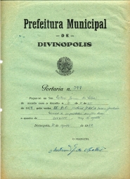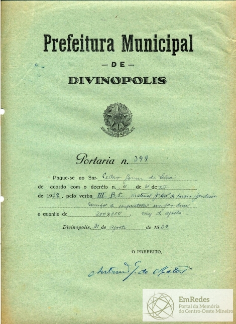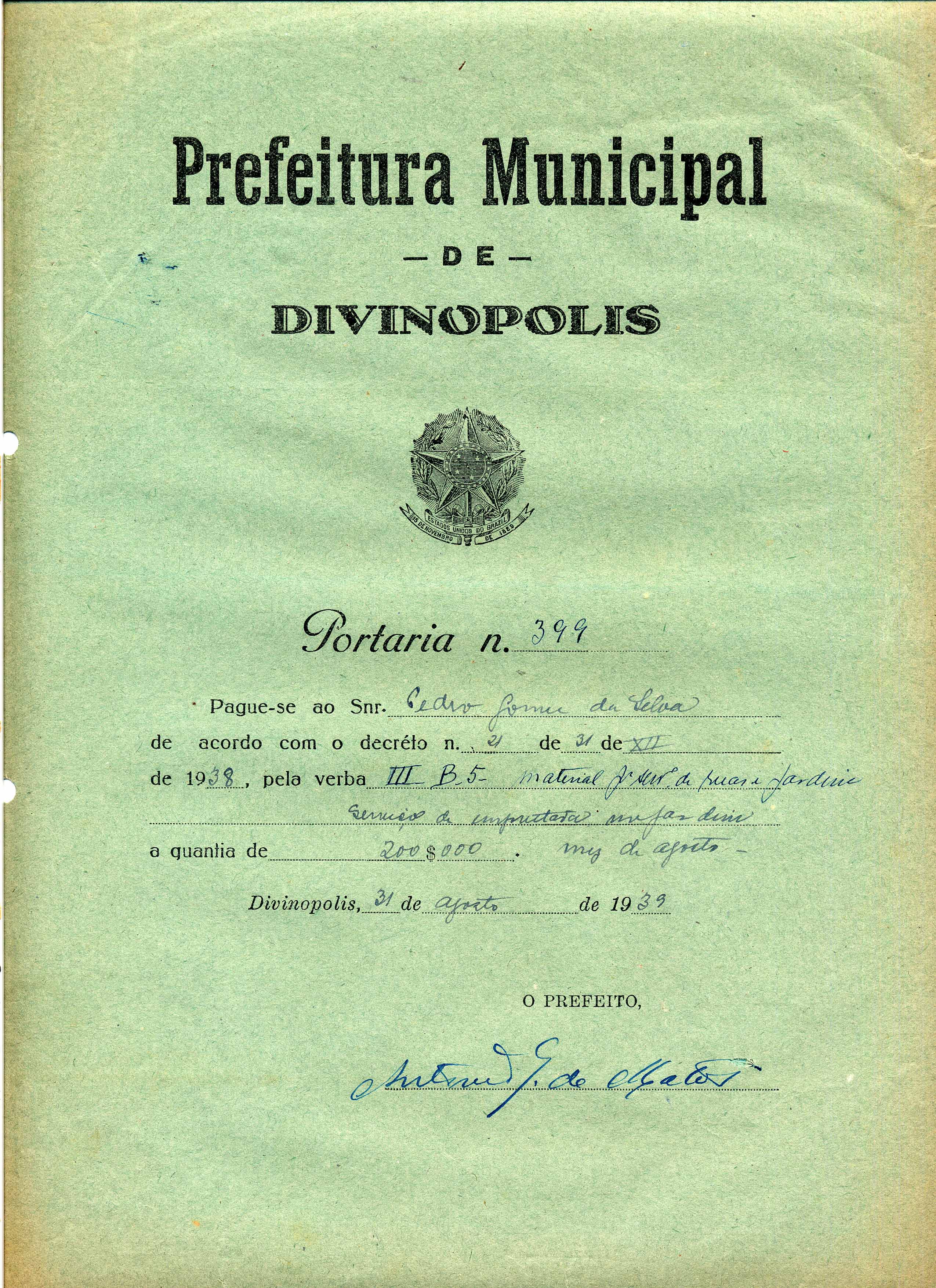 PREFEITURA MUNICIPAL DE DIVINÓPOLIS PORTARIA Nº 399 PAGUE-SE AO SNR PEDRO GOMES DA SILVA DE ACORDO COM O DECRETO Nº 21 DE 31 DE XII DE 1938, PELA VERBA III - B- MATERIAL PARA O SERVIÇO DE RUAS E JARDINS - SERVIÇO DE EMPREITADA NO JARDIM - MEZ(SIC) DE AGOSTO A QUANTIA DE 200$000 (DUZENTOS MIL RÉIS) PREFEITO: ANTONIO GONÇALVES DE MATOS OBS: RECIBO REFERENTE A SERVIÇOS FEITOS POR EMPREITADA NO JARDIM PÚBLICO.