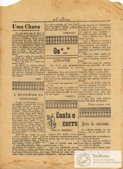 Palavras-chave: Jornal, A Penna, Grêmio Literário, Primeira Edição, Juventude, Divinópolis, Poema, Enterrado Vivo, Conto, Literatura, Mendicidade, Mendigos, Farsantes, Fogos de Artificio, Barulho, Baderna, Texto, Diálogo, Visitas, Liceu Divinópolis, Teatro.