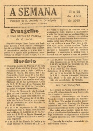 A SEMANA - JORNAL DE DISTRIBUIÇÃO INTERNA DA PARÓQUIA DE SANTO ANTÔNIO. INFORMAÇÕES - AVISOS - ARTIGOS RELIGIOSOS E OUTROS. NA PRIMEIRA PÁGINA: EVANGELHO - II DOM. DEPOIS DA PÁSCOA (Jo. 10, 11-16) NA EDITORIA "CIRCULO OPERÁRIO": [NÃO TEM]