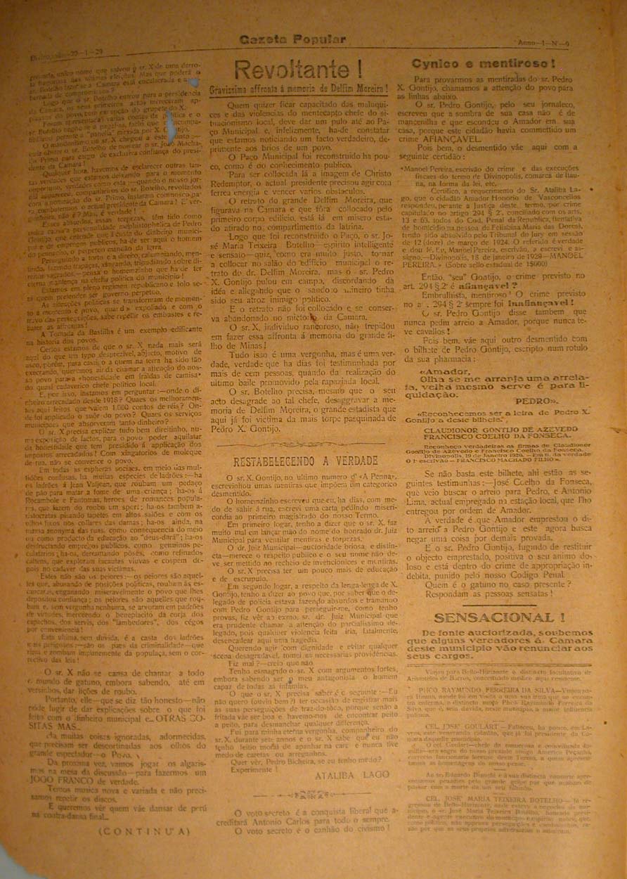 Jornal Gazeta Popular, contém reportagens, notícias, informações, artigos diversos e propagandas - Primeira página: "Minas, desta vez, não pode recuar" - sobre a sucessão para a presidência da república - "res, no verba!" - assuntos políticos locais - críticas à Pedro X. Gontijo.