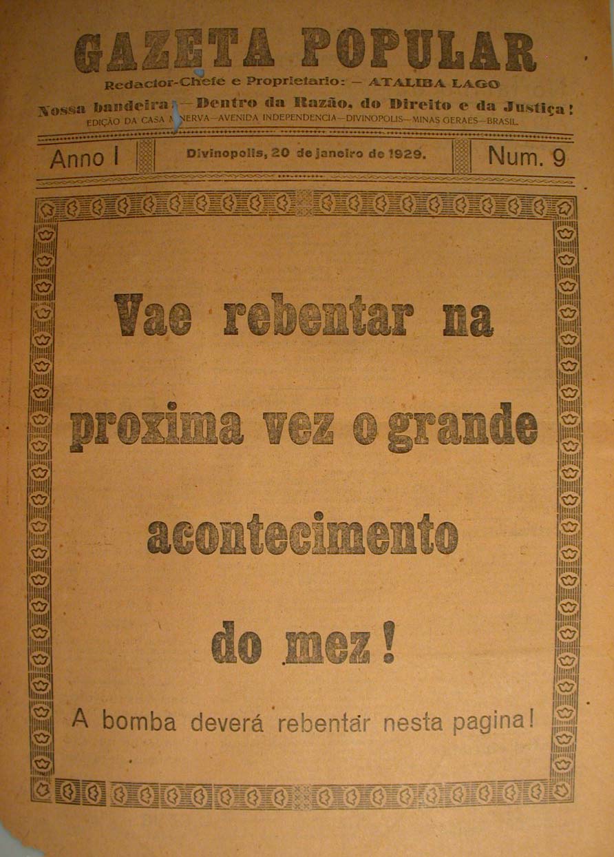 Jornal Gazeta Popular, contém reportagens, notícias, informações, artigos diversos e propagandas - Primeira página: "Minas, desta vez, não pode recuar" - sobre a sucessão para a presidência da república - "res, no verba!" - assuntos políticos locais - críticas à Pedro X. Gontijo.