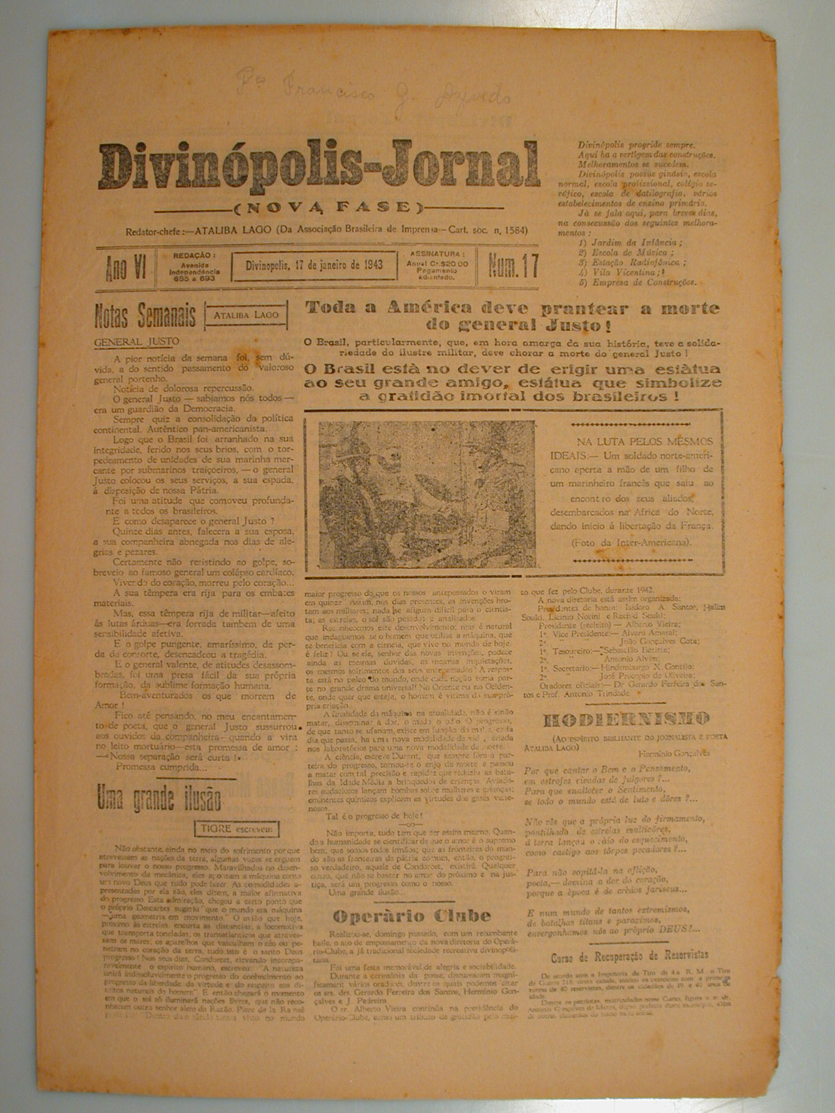 Primeira página do Divinópolis Jornal, ano 6, número 17. Divinópolis, 17/01/1943.