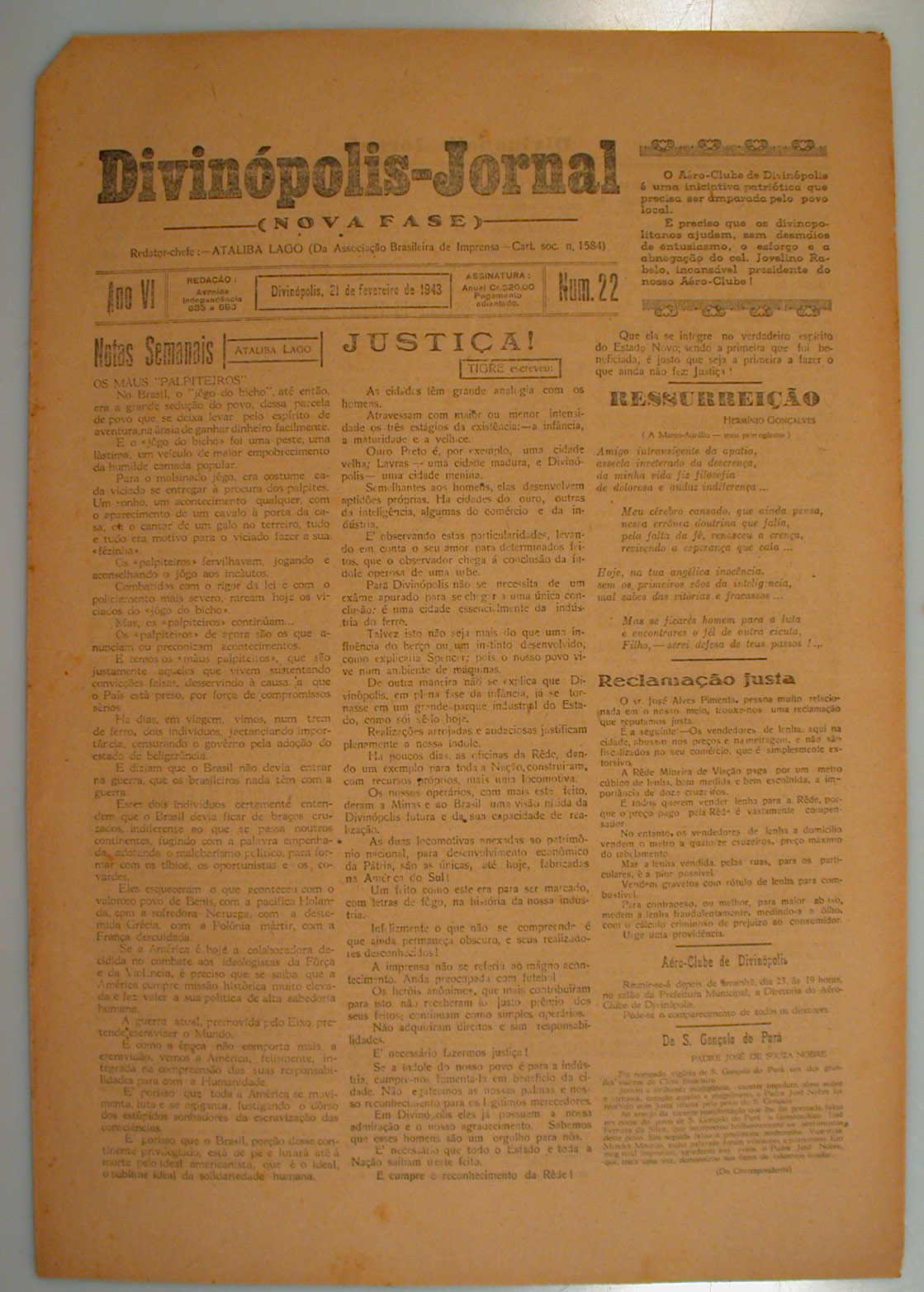 Primeira página do Divinópolis Jornal, ano 6, número 22. Divinópolis, 21/02/1943.