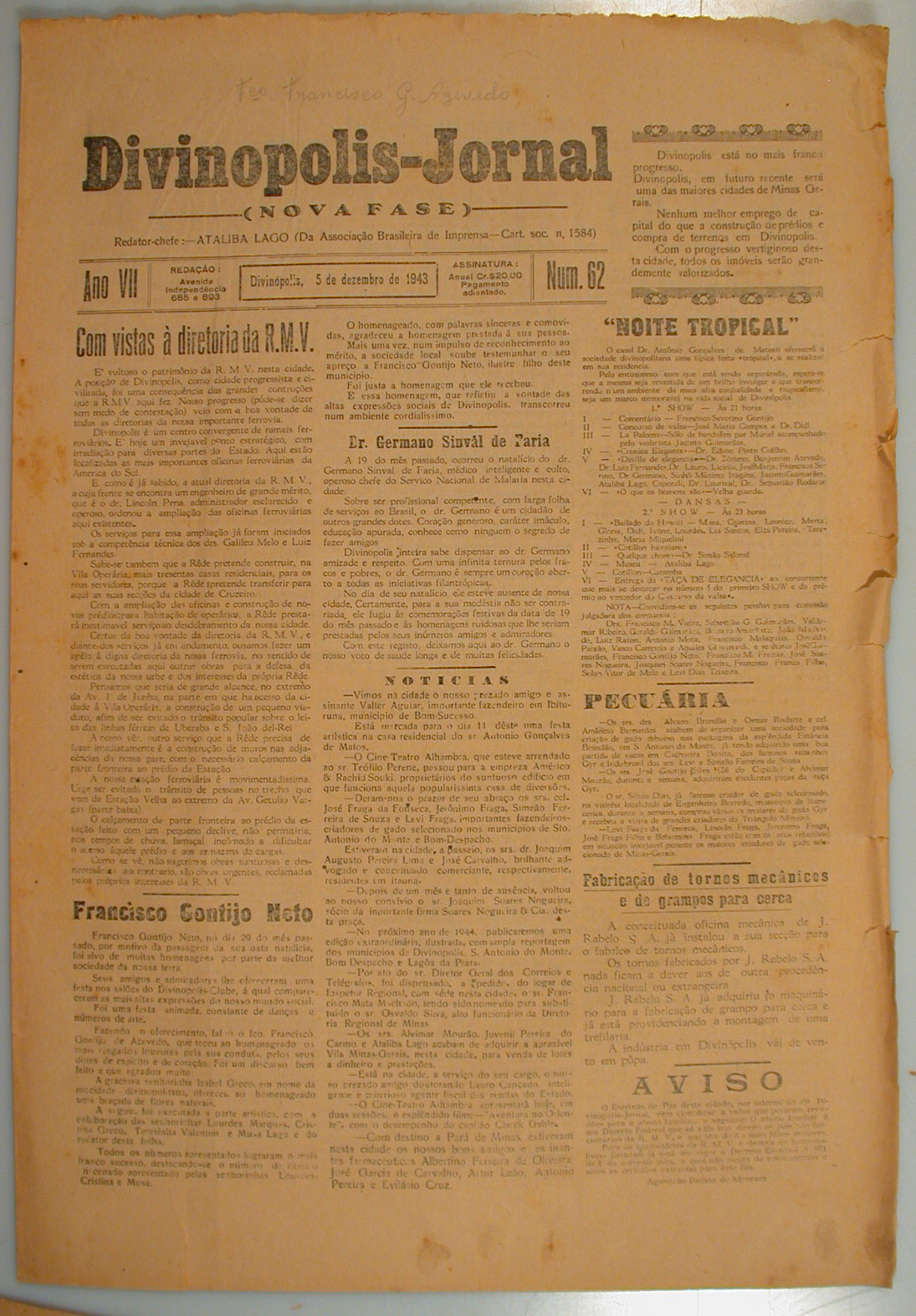 Primeira página do Divinópolis Jornal, ano 7, número 62. Divinópolis, 05//1943.