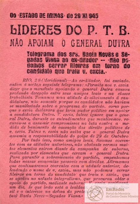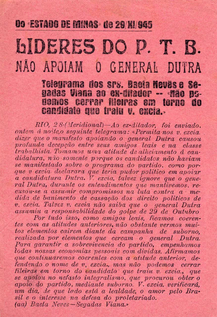 BOLETINS E SUPLEMENTOS - LÍDERES DO P.T.B. NÃO APOIAM O GENERAL DUTRA.