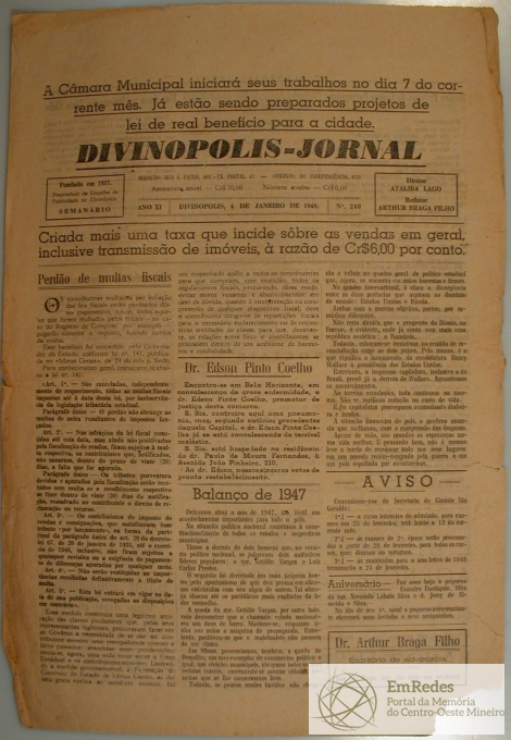 Primeira página do Jornal Divinópolis, ano 11, número 240. Divinópolis, 04/01/1948.