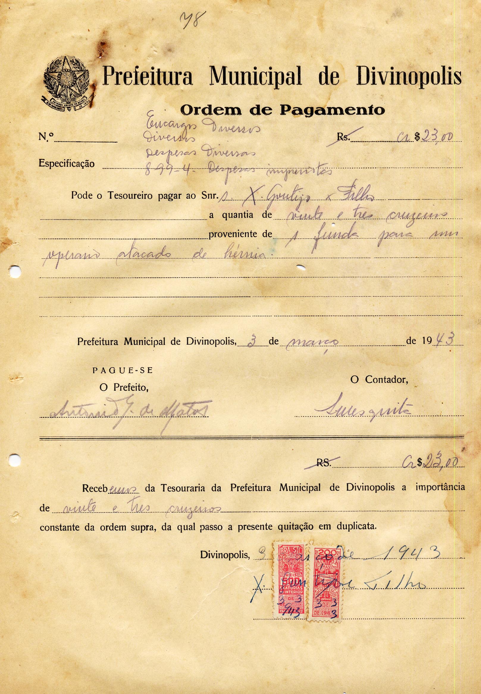 PREFEITURA MUNICIPAL DE DIVINÓPOLIS, 03 DE MARÇO DE 1943