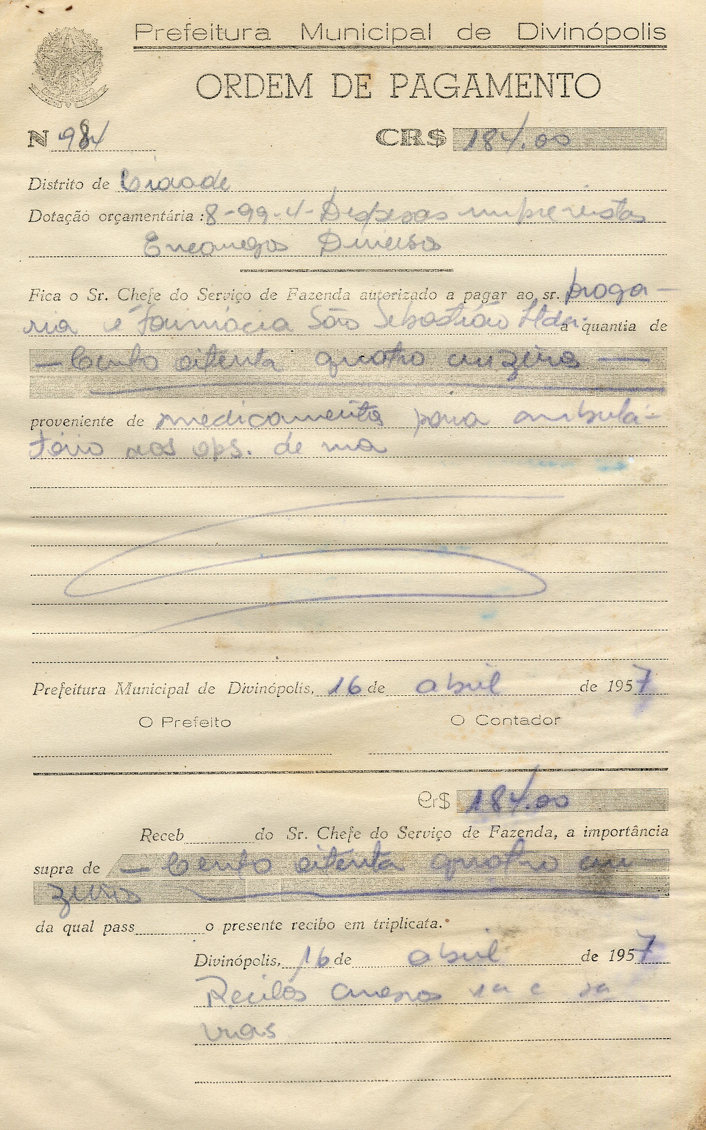 RECEBI DO SR. CHEFE DO SERVIÇO DE FAZENDA, A IMPORTÂNCIA SUPRA DE CENTO OITENTA QUATRO CRUZEIROS DA QUAL PASSO O PRESENTE RECIBO EM TRIPLICATA.