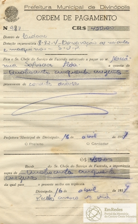 RECEBI DO SR. CHEFE DO SERVIÇO DE FAZENDA, A IMPORTÂNCIA SUPRA DE QUATROCENTOS CINQUENTA CRUZEIROS DA QUAL PASSO O PRESENTE RECIBO EM TRIPLICATA.