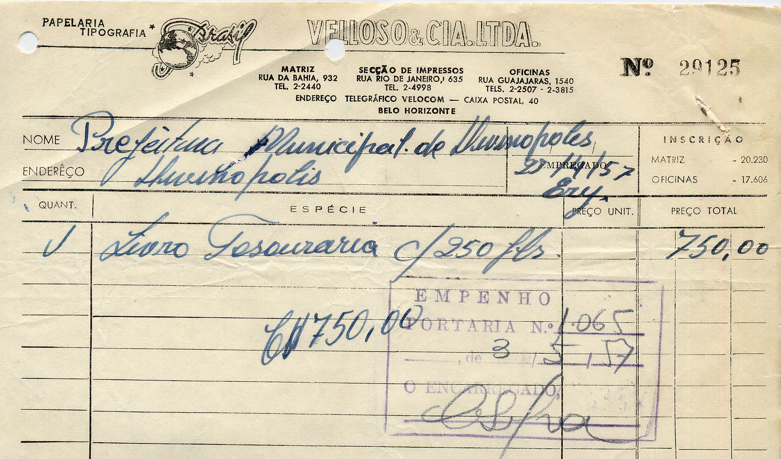 FICA O SR. CHEFE DO SERVIÇO DE FAZENDA AUTORIZADO A PAGAR AO SR. VELLOSO E CIA. LTDA. A QUANTIA DE SETECENTOS CINQUENTA CRUZEIROS PROVENIENTE DE 01 LIVRO TESOURARIA