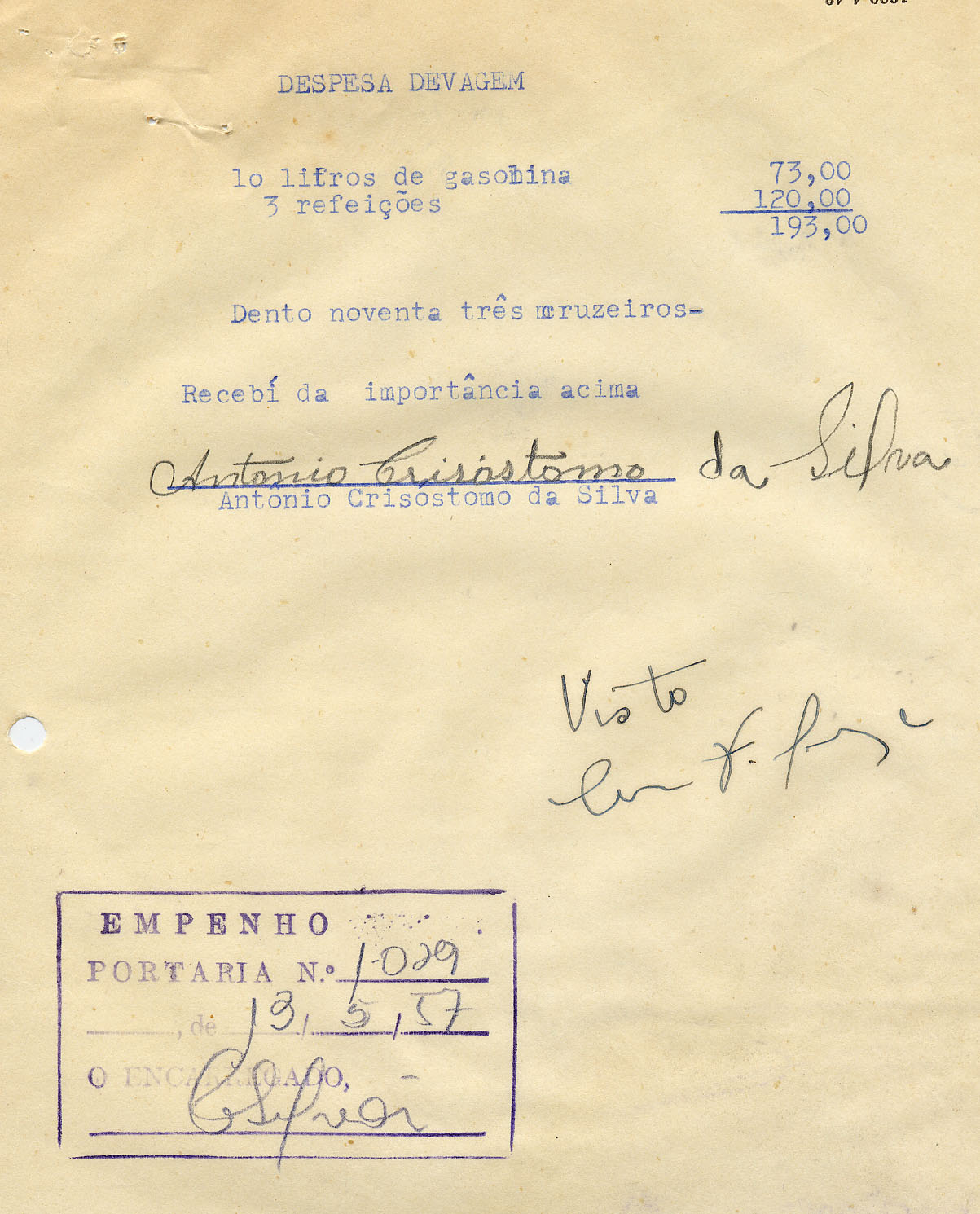 FICA O SR. CHEFE DO SERVIÇO DE FAZENDA AUTORIZADO A PAGAR AO SR. ANTÔNIO CRISÓSTOMO DA SILVA A QUANTIA DE CENTO NOVENTA TRÊS CRUZEIROS PROVENIENTE DE DESPESAS VIAGEM