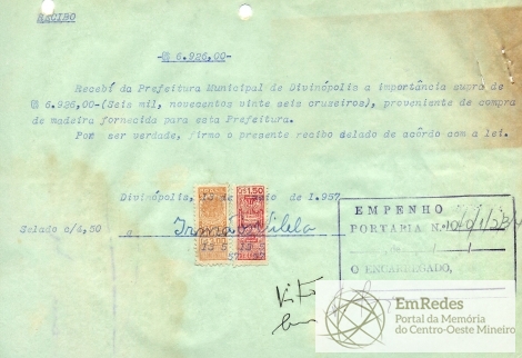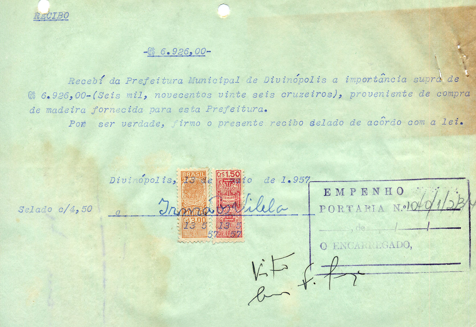 RECEBI DO SR. CHEFE DO SERVIÇO DE FAZENDA, A IMPORTÂNCIA SUPRA DE DOIS MIL, QUINHENTOS DEZOITO CRUZEIROS DA QUAL PASSO O PRESENTE RECIBO EM TRIPLICATA.