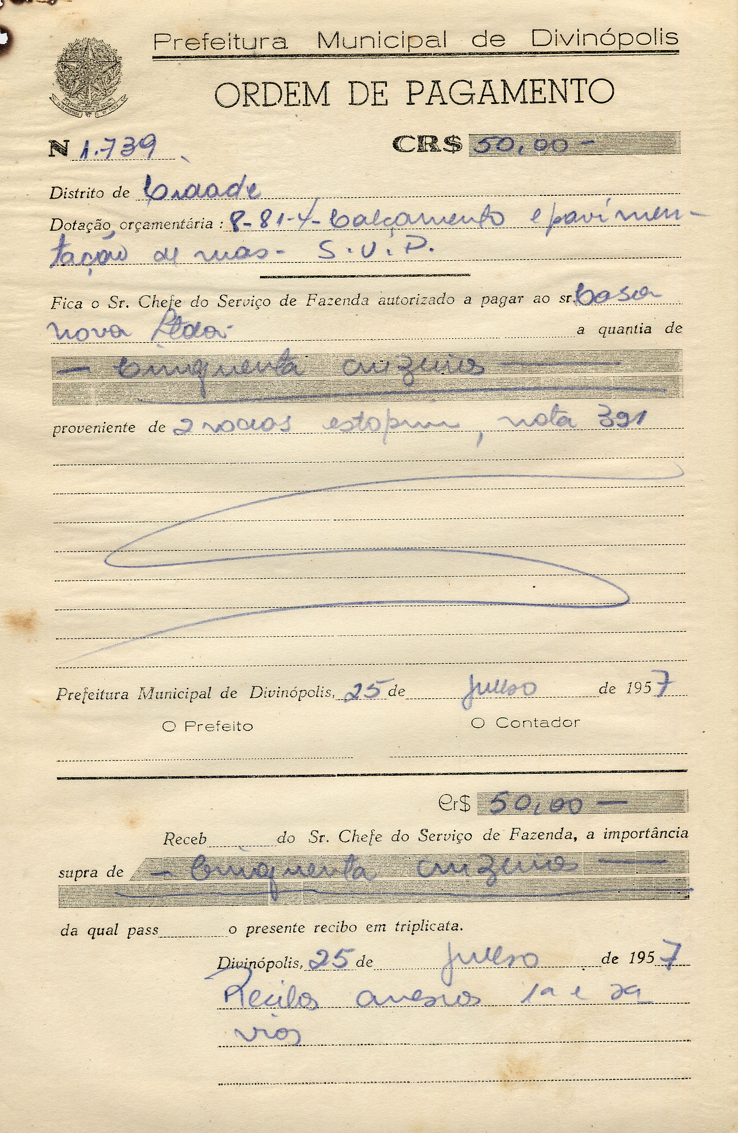 RECEBI DO SR. CHEFE DO SERVIÇO DE FAZENDA, A IMPORTÂNCIA SUPRA DE CINQUENTA CRUZEIROS DA QUAL PASSO O PRESENTE RECIBO EM TRIPLICATA.