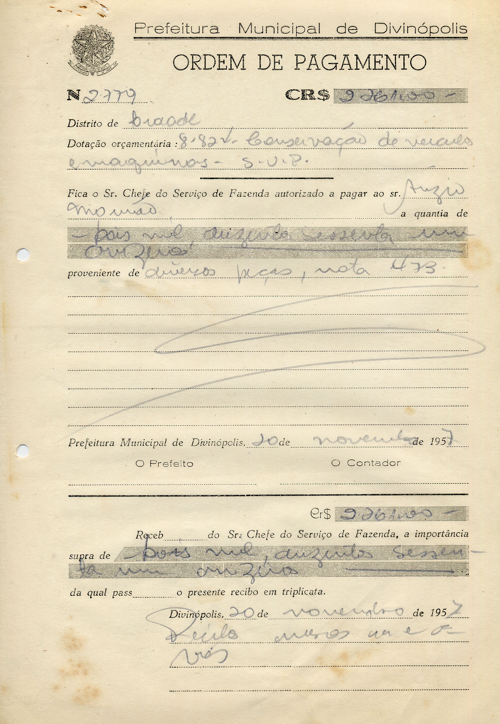 RECEBI DO SR. CHEFE DO SERVIÇO DE FAZENDA, A IMPORTÂNCIA SUPRA DE DOIS MIL, DUZENTOS SESSENTA UM CRUZEIROS QUAL PASSO O PRESENTE RECIBO EM TRIPLICATA.