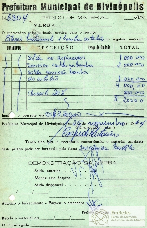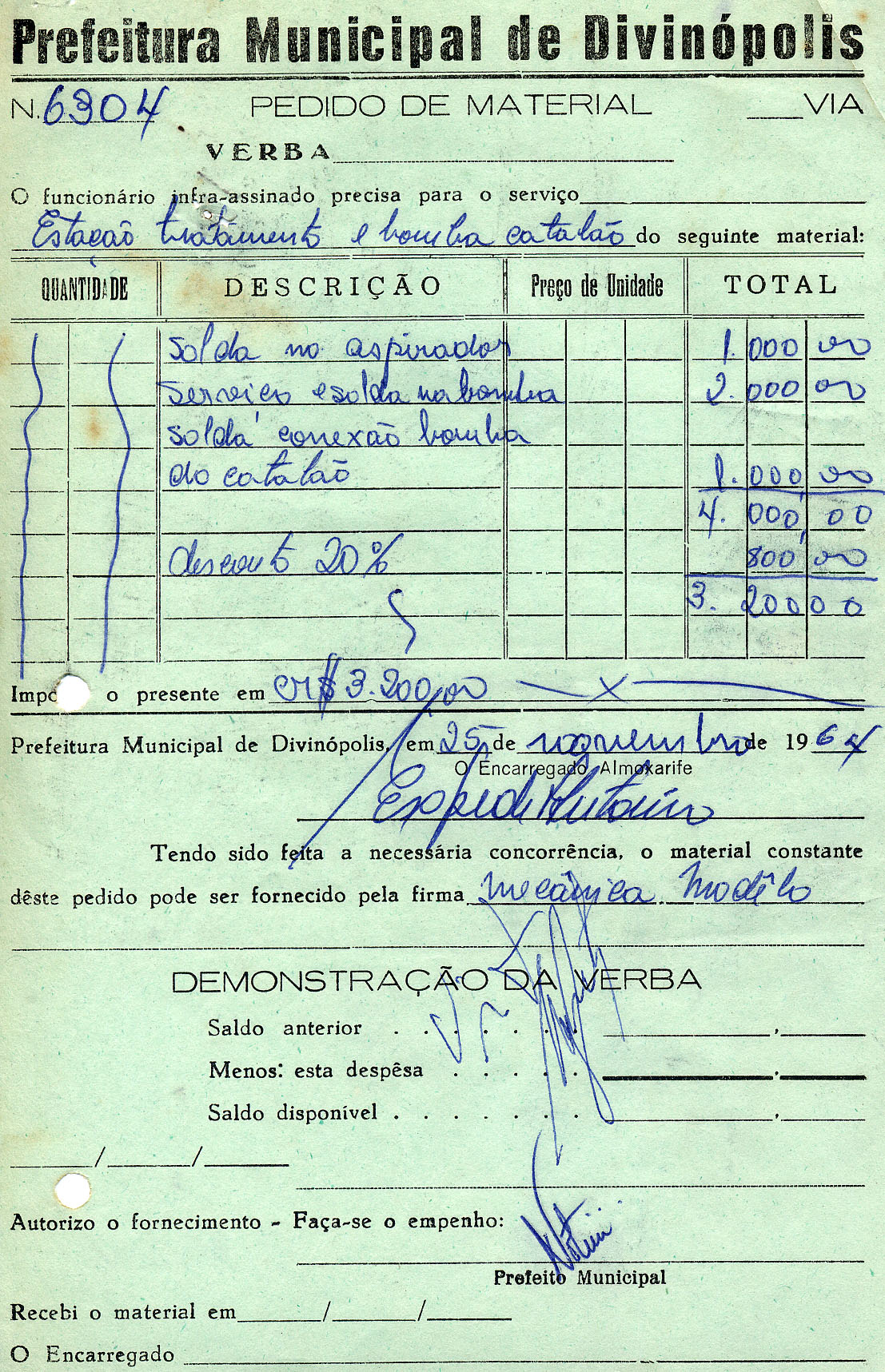 PREFEITURA MUNICIPAL DE DIVINÓPOLIS - ORDEM DE PAGAMENTO Nº 4091 CR$ 3.200,00 DISTRITO DE CIDADE DOTAÇÃO ORÇAMENTÁRIA: 8-63-3 MATERIAL PARA SERVIÇO DE ÁGUA, SERVIÇOS INDUSTRIAIS FICA O SR. CHEFE DO SERVIÇO DE FAZENDA AUTORIZADO A PAGAR AO SR.PASCOALINO DELLARETTI A QUANTIA DE TRÊS MIL E DUZENTOS CRUZEIROS PROVENIENTE DE SERVIÇO NA BOMBA DÁGUA. PREFEITURA MUNICIPAL DE DIVINÓPOLIS, 11 DE DEZEMBRO DE 1964. RECEBI DO SR. CHEFE DO SERVIÇO DE FAZENDA A IMPORTÂNCIA SUPRA DE TRÊS MIL E DUZENTOS CRUZEIROS DA QUAL PASSO O PRESENTE RECIBO EM TRIPLICATA. DIVINÓPOLIS, 11 DE DEZEMBRO DE 1964.