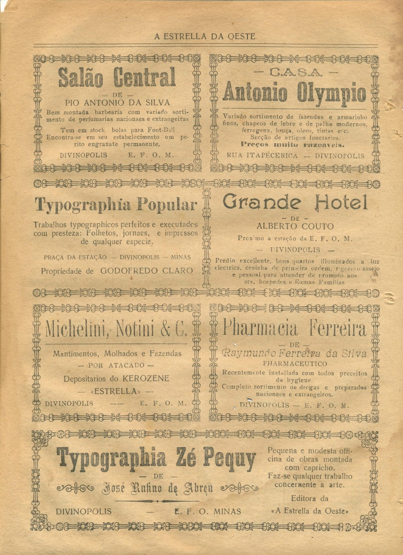 Jornal - A Estrella do Oeste - A Estrella d Oeste - A Estrella da Oeste - Pleito em Divinópolis - Padre Bicalho - Pará de Minas - Centro de Minas - Amor e Amizade - Academia de Historia Internacional - Bernardo Guimarães - Escola Padre Mathias - Comemorações - Social - Caleidoscópio - Pensamentos - Arrecadação de Fundos - Maquinistas - Proibição de Animais nas ruas - Eleições Municipais - Impostos - Notas - Casamentos - Publicidades.