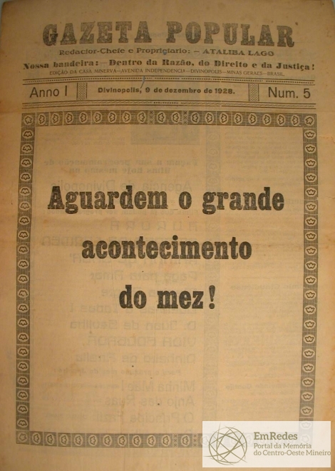 Página do Jornal Gazeta Popular, que tinha como dono e redator e Ataliba Lago, ANNO I, 09 de Dezembro 1928,n° 05.