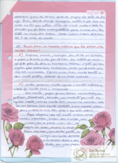 Quinta parte da Carta manuscrita enviada para a "prima Laurinda", enviada por Irilda, do Rio de Janeiro com a data de 05 de julho de 2010, o texto fala sobre uma conversa amistosa entre os interlocutores, na qual se fala sobre a mãe e de Laurinda e ela responde algumas perguntas.