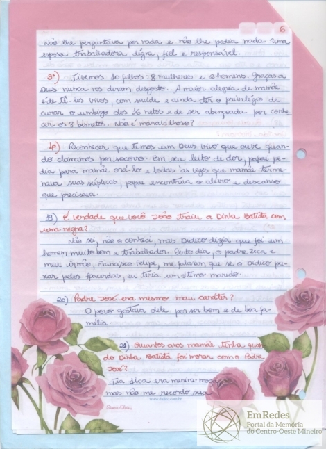 Sexta parte da Carta manuscrita enviada para a "prima Laurinda", enviada por Irilda, do Rio de Janeiro com a data de 05 de julho de 2010, o texto fala sobre uma conversa amistosa entre os interlocutores, na qual se fala sobre a mãe e de Laurinda e ela responde algumas perguntas.