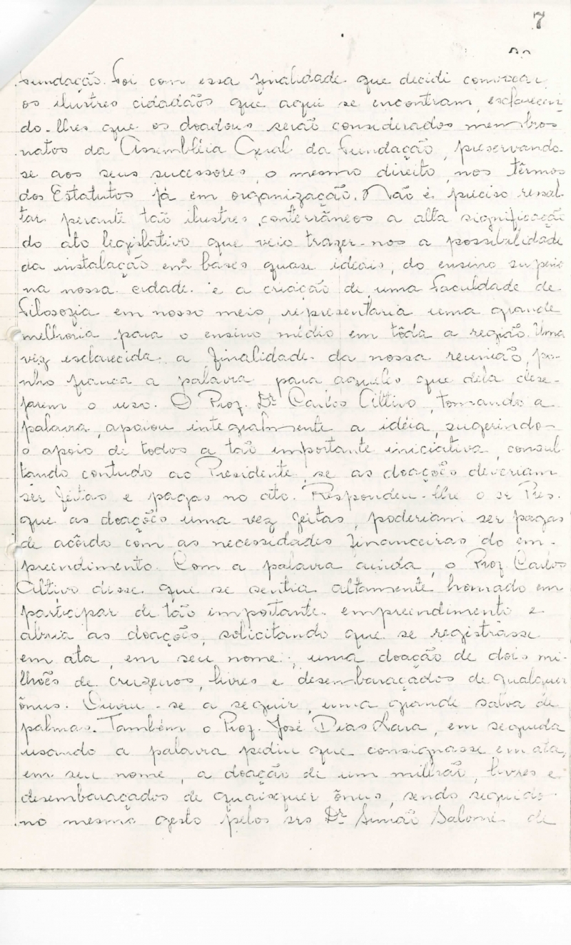 A Reunião Preparatória da Fundação Faculdade de Filosofia e Letras de Divinópolis, cria assembléia destinada a colocar em prática as determinações do Governo do Estado de Minas Gerais, que institui a Fundação Faculdade de Filosofia e Letras de Divinópolis com o objetivo de criar uma mantenedora para a instituição de ensino superior de mesmo nome. No texto, é explicitada intenção do governo estadual de qualificar os trabalhadores para a organização superior, supervisão e orientação de escolas e sistemas escolares e professores licenciados para o Ensino Médio. A reunião serviu ainda para formar o fundo inicial de financiamento da instituição e descreve, em seqüência, os doadores e as quantias doadas.