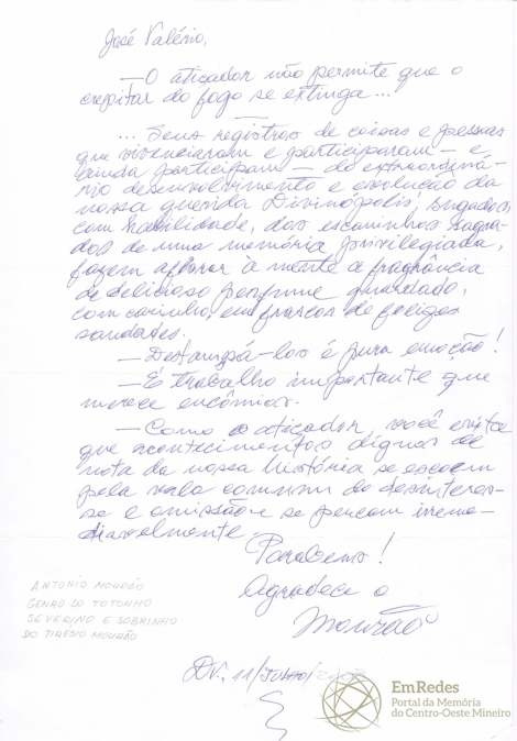 José Valério, Divinópolis, Memória, Antônio Mourão, carta, 2003.