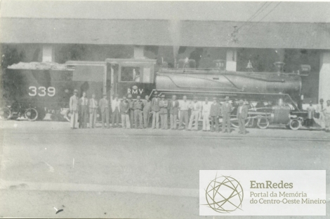 Na imagem, vê-se homens não identificados, enfileirados em frente a locomotiva nº 339, primeira a ser construída nas oficinas de Divinópolis.