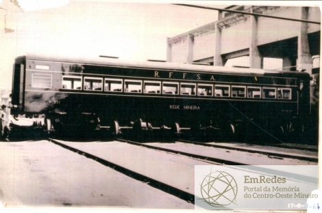 Vagão sendo construído na linha de produção, na oficina da Rede Mineira de Viação, na cidade de Divinópolis. No verso da fotos, lê-se: Moderno carro metálico (1ª classe), que substituirão os velhos carros de madeira 17-08-64.