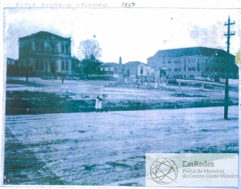 Praça Benedito Valadares, conhecida também como Praça do Santuário. É possível verificar ao fundo, lado direito, o prédio do Instituto Nossa Senhora do Sagrado Coração, colégio da cidade de Divinópolis.