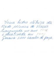 Casa de máquinas da Usina Hidrelétrica da Rede Mineira de Viação. Segundo informações do verso dos documentos, foi construída em 1914 e desativada em 1979.