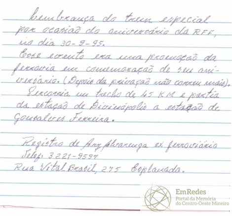 Evento comemorativo do aniversário da Rede Ferroviária Federal S/A. Registro feito por Ary Alvarenga. Foi realizado nas estações Gonçalves Ferreira, no município de Itapecerica, e Divinópolis.