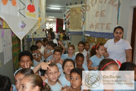A imagem mostra a visita dos alunos da Escola Municipal João Gontijo da Fonseca à exposição Memória e Arte nas atividades do PIBID do curso de História, durante a 4ª Semana da UEMG.