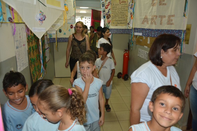 A imagem mostra a visita dos alunos da Escola Municipal João Gontijo da Fonseca à exposição Memória e Arte nas atividades do PIBID do curso de História, durante a 4ª Semana da UEMG.