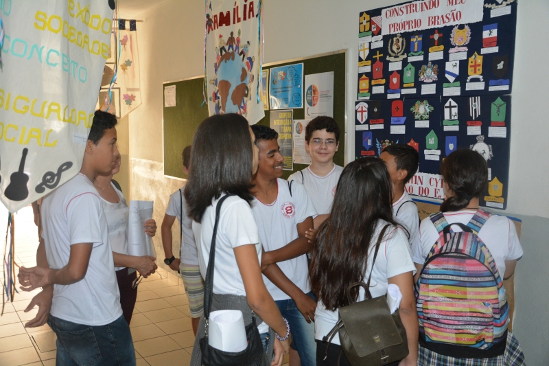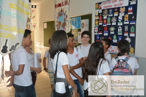 A imagem mostra a visita dos alunos da Escola Estadual Martin Cyprien à exposição Memória e Arte do PIBID do curso de História, durante a 4ª Semana da UEMG.