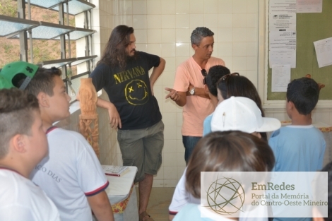 A imagem mostra a visita dos alunos da Escola Estadual Professor Chico Dias à exposição Mineiridades, de Luan Marvin, durante a 4ª Semana da UEMG.
