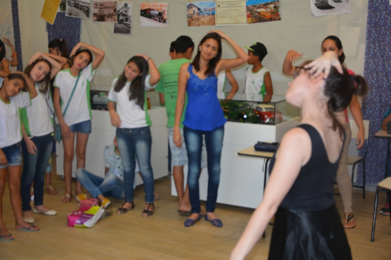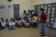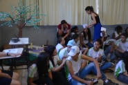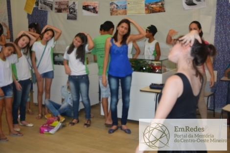 A imagem mostra a visita dos alunos da Escola Estadual Melquides Batista de Miranda à oficina: Saberes, Labores e Oficios - Educação Patrimonial, desenvolvida pelo Centro de Memória durante a 4ª Semana da UEMG.