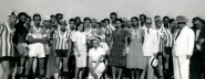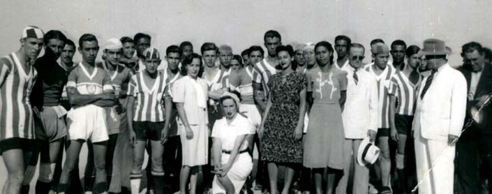 Clássico entre o time do Ferroviário e o time do Internacional (Ex-Guarani), década de 1940. Time do Ferroviário usando blusas listradas nas cores verde e branco e calções pretos. Time do Internacional usando blusas nas cores branco e vermelho e calções brancos.