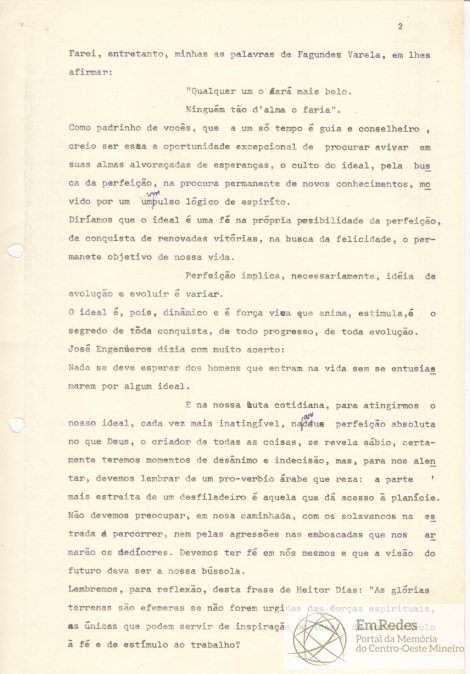 documento de três páginas redigido na qualidade de paraninfo da turma de diplomandos de 1977 do Ginásio Prof. Roberto Carneiro. O autor agradece pela oportunidade de manter uma convivência de vários anos com aqueles jovens e também por ter sido escolhido para receber esta homenagem.