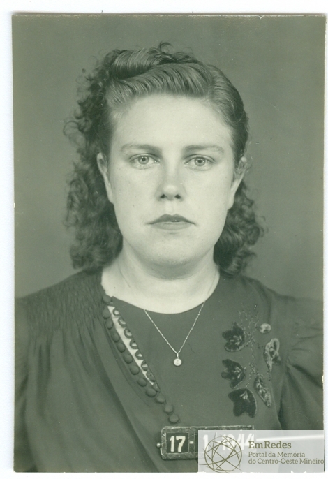 Sem anotações. Fotografia em preto e branco, de uma mulher adulta. A foto é, aparentemente, formal. O enquadramento é feito do busto para cima, limitando-se aos ombros e com enfoque no rosto. Há uma placa sendo colocada no canto inferior direito da fotografia indicando a data de 17-1-1944. A mulher possui expressão série, cabelos presos e usa um pequeno colar.