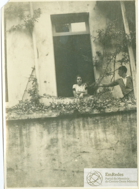 Sem anotações. Fotografia em preto e branco em que aparecem dois jovens. A foto, aparentemente, foi tirada de baixo para cima, há uma mulher debruçada em uma grande janela, há algumas plantas abaixo e, no lado direito da fotografia, um homem estica as mãos para o lado da moça, ele está em uma sacada ou varanda próxima da janela em que ela se encontra.