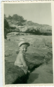 Sem anotações. Fotografia em preto e branco. A fotografia tem como foco uma criança, homem, sem camisa, de boné. O cenário é de uma região rochosa a beira de um rio ou de um lago, ao fundo é possível ver parte de algumas árvores. O garoto está sentado a beira da rocha próximo à água, no lado esquerdo é possível ver uma pequena parte de uma garota, em pé.