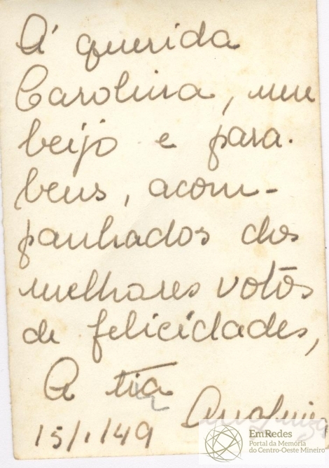 “À querida Carolina, um beijo e parabéns, acompanhados dos melhores votos de felicidades, a tia Ana Luiza. 15/1/49.”