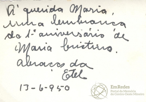 “A querida Maria, uma lembrança do 1º aniversário de Maria Cristina, abraço da Etel. 13-6-950”.