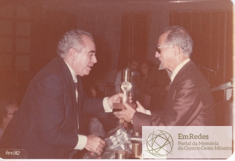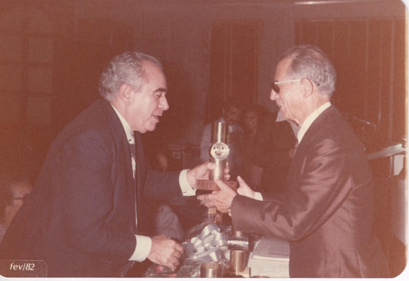 “Recebendo um troféu de uma promoção do Jornal do Oeste, em 1981”. Fotografia de Luiz Fernandes recebendo um premio de um homem adulto (sem identificação).