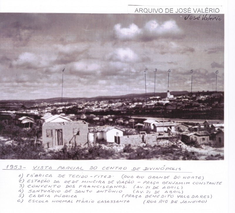 Esta foto retrata a vista parcial do centro de Divinópolis. Na imagem em questão José Valério numerou alguns pontos da cidade. O número um faz menção à fábrica de tecido Fited, localizada na rua Rio Grande do Norte.